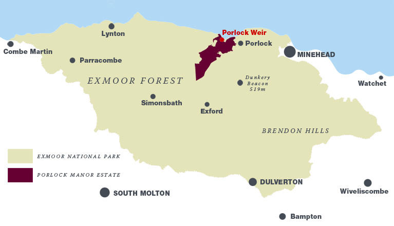The Porlock Manor Estate is at the heart of the Exmoor National Park and is easily reached via the A39 through Minehead, or more dramatically across Exmoor from Dulverton on the B3223, then via Exford and the Porlock scenic toll road.